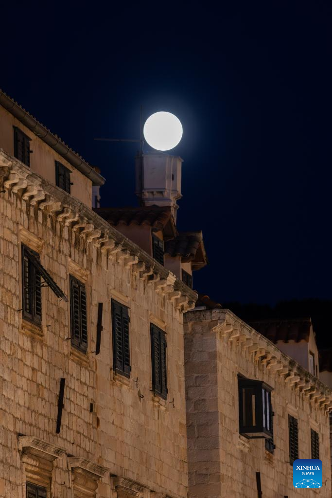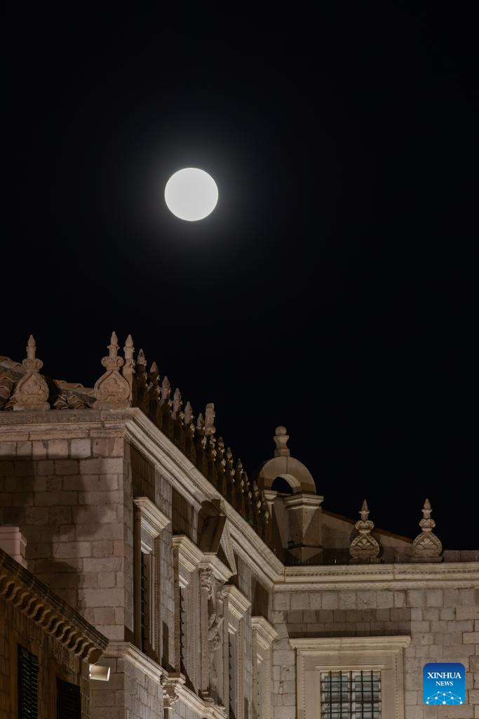 A full moon rises over the old town of Dubrovnik, Croatia, on Oct. 6, 2025. (Grgo Jelavic/PIXSELL via Xinhua)