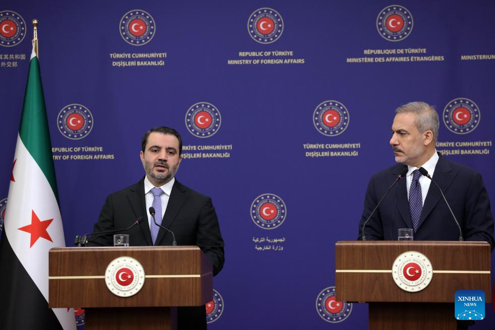 Turkish Foreign Minister Hakan Fidan (R) and Syria's foreign affairs chief Asaad Hassan al-Shibani attend a joint press conference in Ankara, Türkiye, Oct. 8, 2025. (Mustafa Kaya/Handout via Xinhua)
