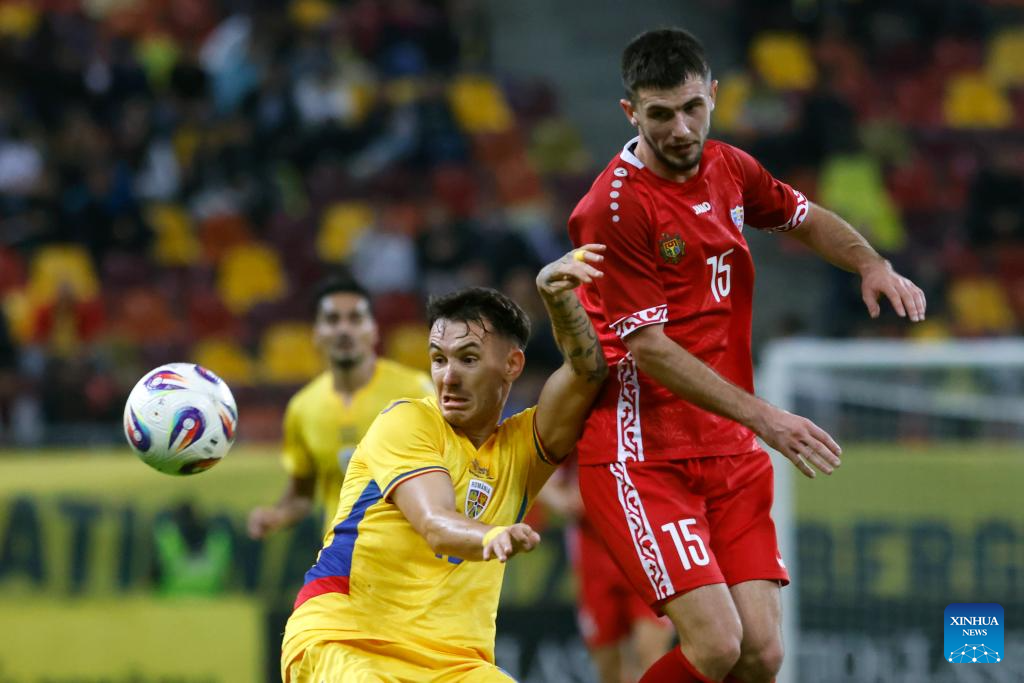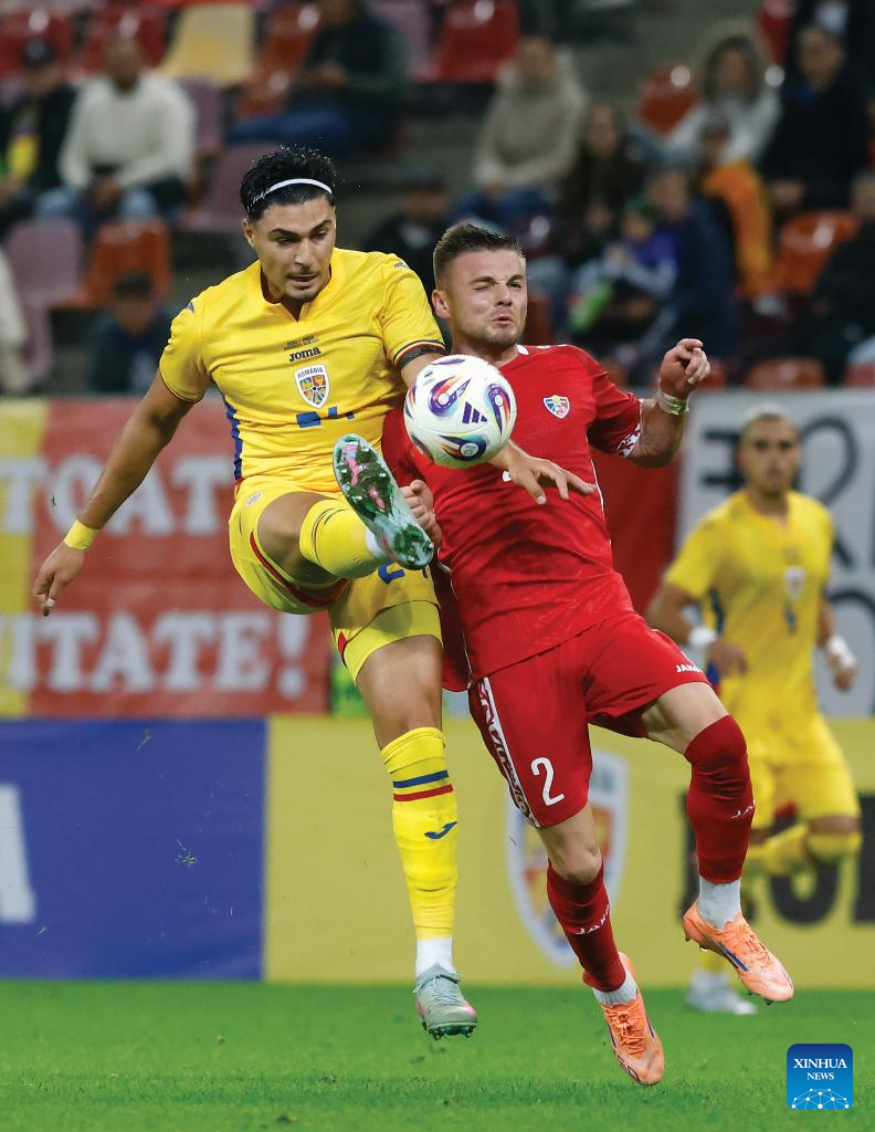 Romania's Lisav Naif Eissat (L) vies with Moldova's Oleg Reabciuk during the international friendly football match between Romania and Moldova at Arena Nationala stadium in Bucharest, Romania, Oct. 9, 2025. (Photo by Cristian Cristel/Xinhua)
