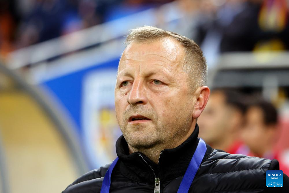 Moldova's head coach Lilian Popescu looks on before the international friendly football match between Romania and Moldova at Arena Nationala stadium in Bucharest, Romania, Oct. 9, 2025. (Photo by Cristian Cristel/Xinhua)