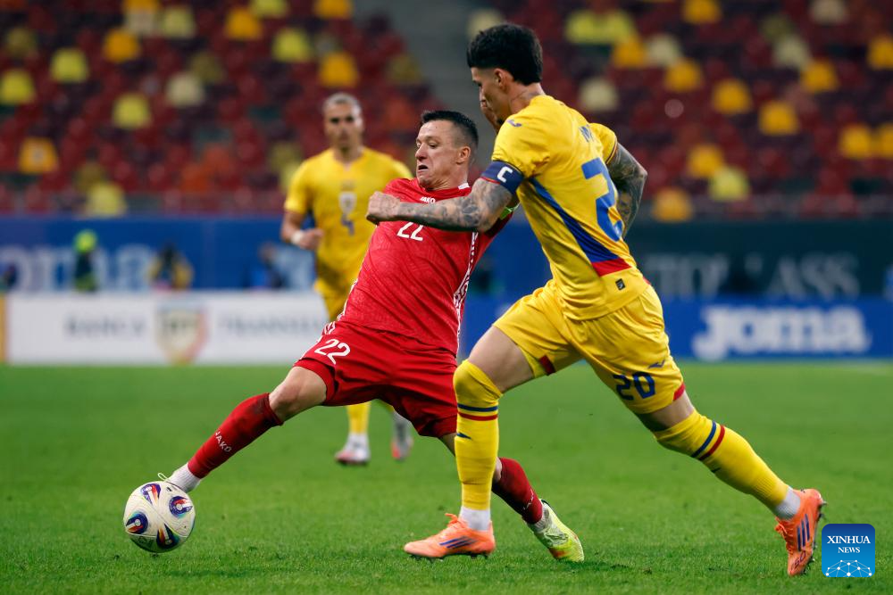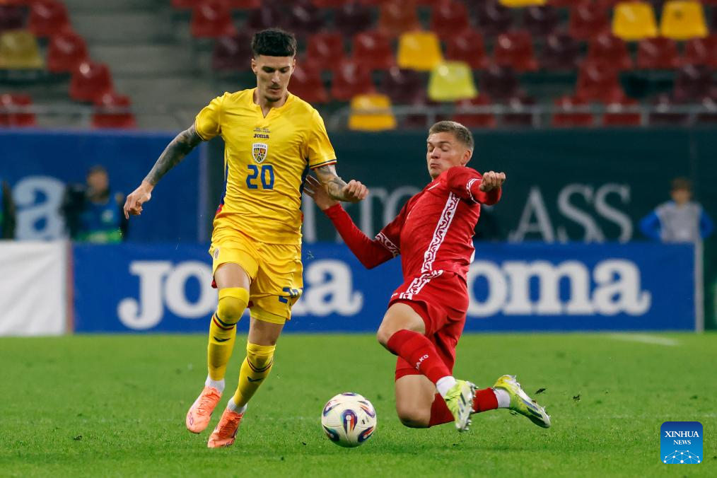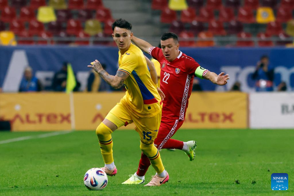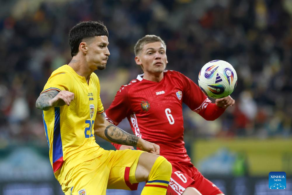 Romania's Dennis Man (L) vies with Moldova's Mihail Gherasimencov during the international friendly football match between Romania and Moldova at Arena Nationala stadium in Bucharest, Romania, Oct. 9, 2025. (Photo by Cristian Cristel/Xinhua)