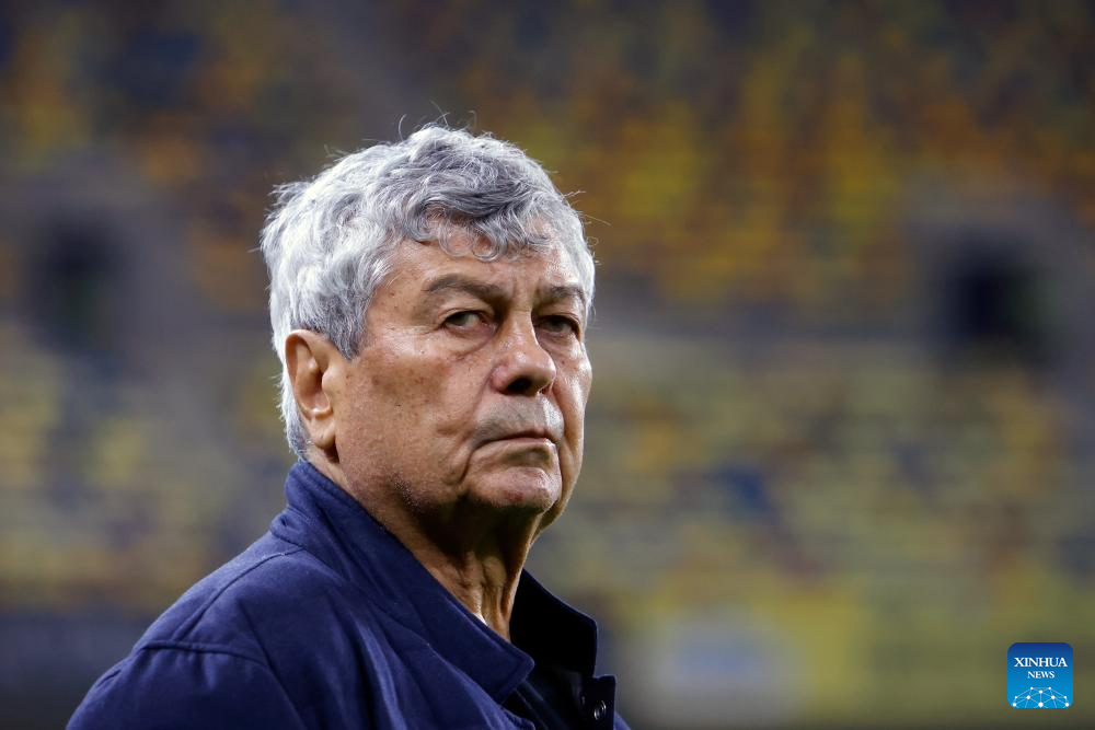 Romania's head coach Mircea Lucescu looks on before the international friendly football match between Romania and Moldova at Arena Nationala stadium in Bucharest, Romania, Oct. 9, 2025. (Photo by Cristian Cristel/Xinhua)