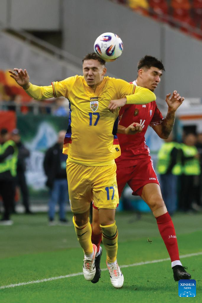 Romania's Dennis Man (R) vies with Moldova's Vadim Rata during the international friendly football match between Romania and Moldova at Arena Nationala stadium in Bucharest, Romania, Oct. 9, 2025. (Photo by Cristian Cristel/Xinhua)