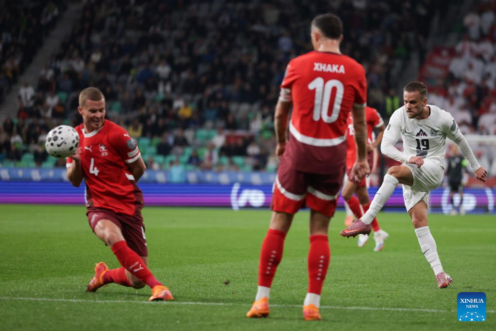 Tomi Horvat (R) of Slovenia shoots during the World Cup 2026 European Qualifiers Group B football match between Slovenia and Switzerland in Ljubljana, Slovenia, Oct. 13, 2025. (Photo by Zeljko Stevanic/Xinhua)