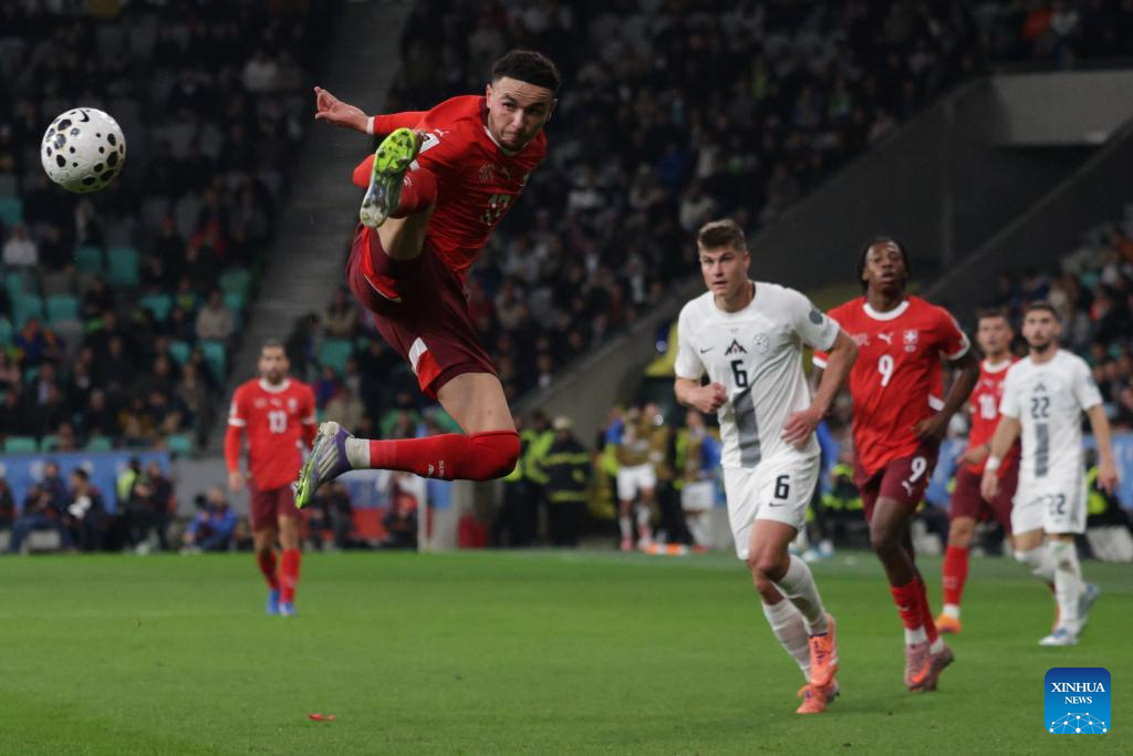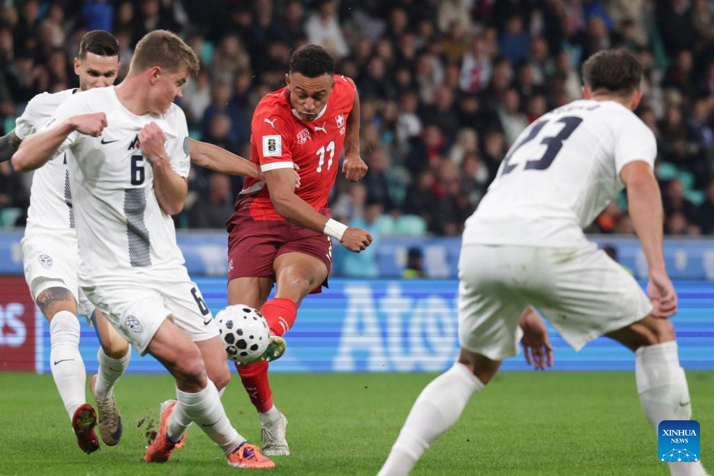 Dan Ndoye (2nd R) of Switzerland competes during the World Cup 2026 European Qualifiers Group B football match between Slovenia and Switzerland in Ljubljana, Slovenia, Oct. 13, 2025. (Photo by Zeljko Stevanic/Xinhua)