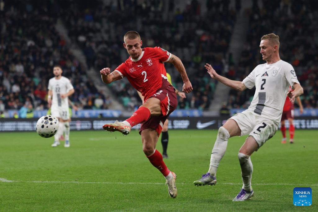 Miro Muheim (L) of Switzerland shoots during the World Cup 2026 European Qualifiers Group B football match between Slovenia and Switzerland in Ljubljana, Slovenia, Oct. 13, 2025. (Photo by Zeljko Stevanic/Xinhua)