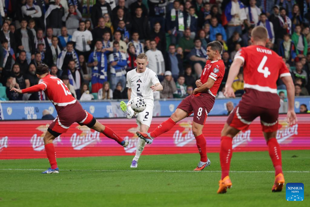 Zan Karnicnik (2nd L) of Slovenia competes during the World Cup 2026 European Qualifiers Group B football match between Slovenia and Switzerland in Ljubljana, Slovenia, Oct. 13, 2025. (Photo by Zeljko Stevanic/Xinhua)
