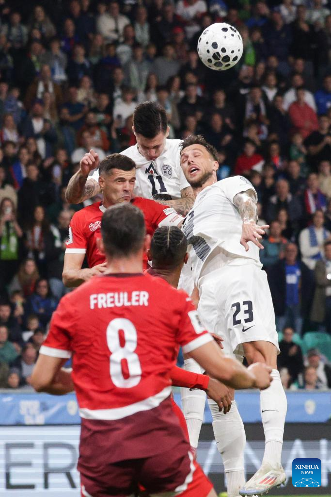 Erik Janza (C) of Slovenia competes for a header with Silvan Widmer of Switzerland (front 2nd L) during the World Cup 2026 European Qualifiers Group B football match between Slovenia and Switzerland in Ljubljana, Slovenia, Oct. 13, 2025. (Photo by Zeljko Stevanic/Xinhua)
