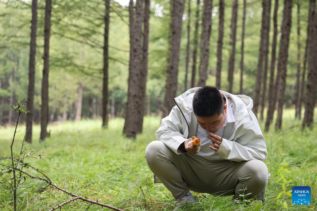Wang Jianshu picks mushrooms in a forest in Chengde City, north China's Hebei Province, Aug. 17, 2025.(Xinhua/Lu Ye)