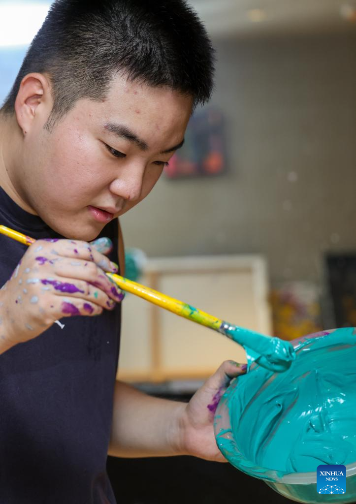 Wang Jianshu jumps for joy while creating a drip painting at his studio in Beijing, capital of China, Aug. 8, 2025.(Xinhua/Lu Ye)
