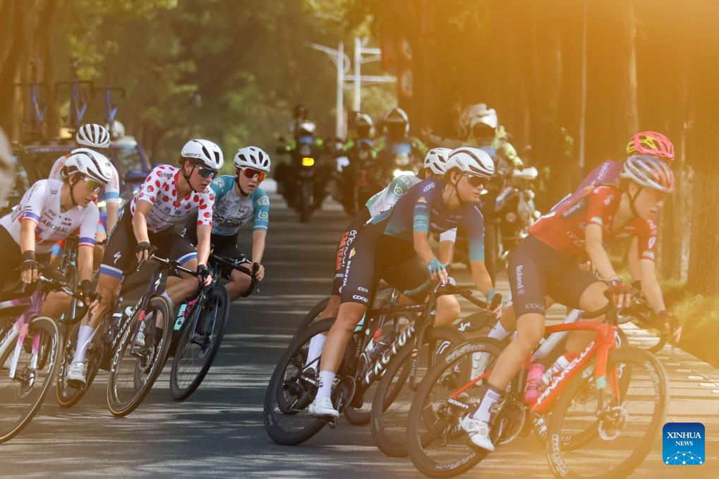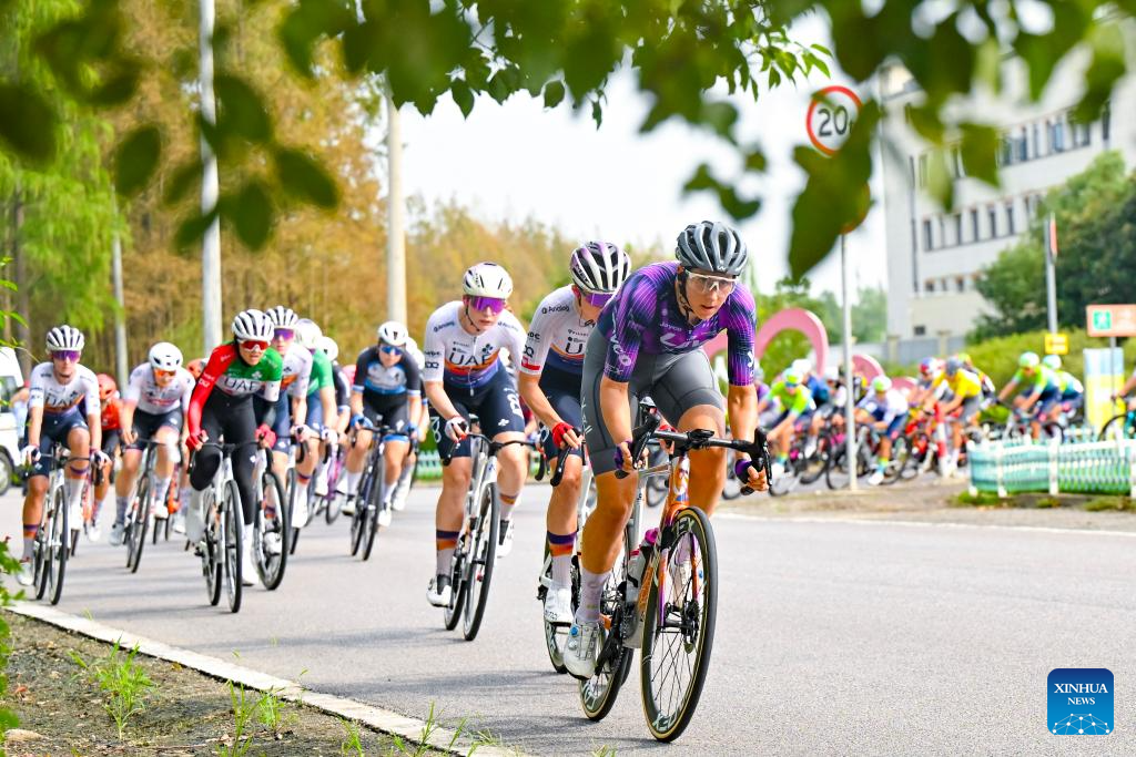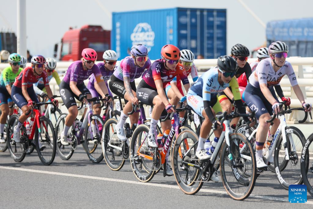 Cyclists compete during the Stage 2 of the UCI Women's WorldTour Tour of Chongming Island road cycling race in Shanghai, east China, Oct. 15, 2025. (Xinhua/Chen Haoming)