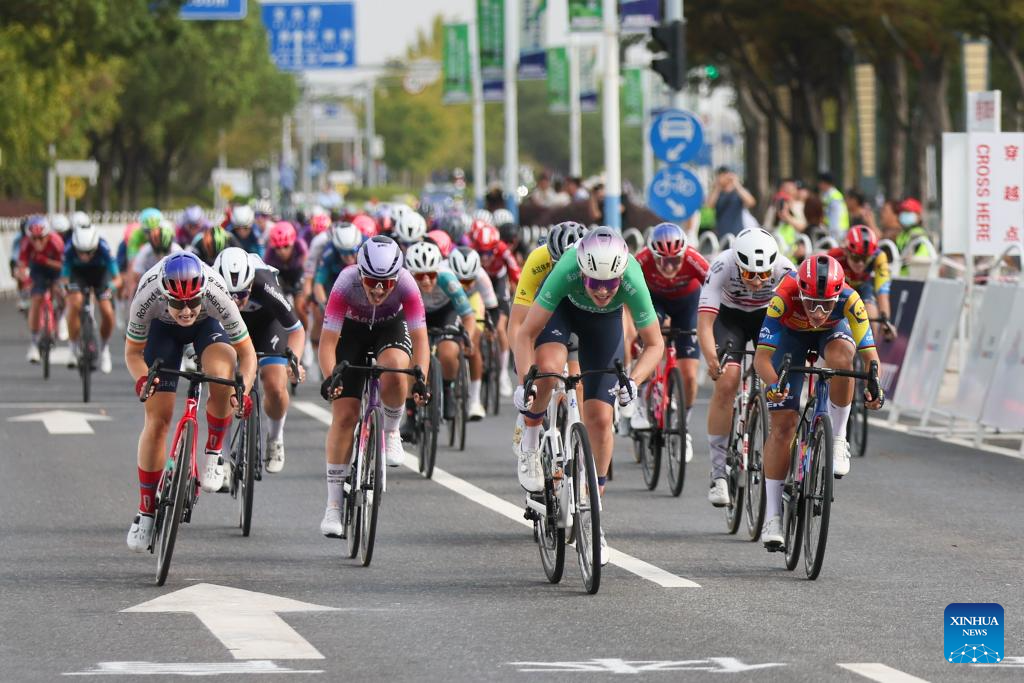 Cyclists sprint during the Stage 2 of the UCI Women's WorldTour Tour of Chongming Island road cycling race in Shanghai, east China, Oct. 15, 2025. (Xinhua/Wang Xiang)
