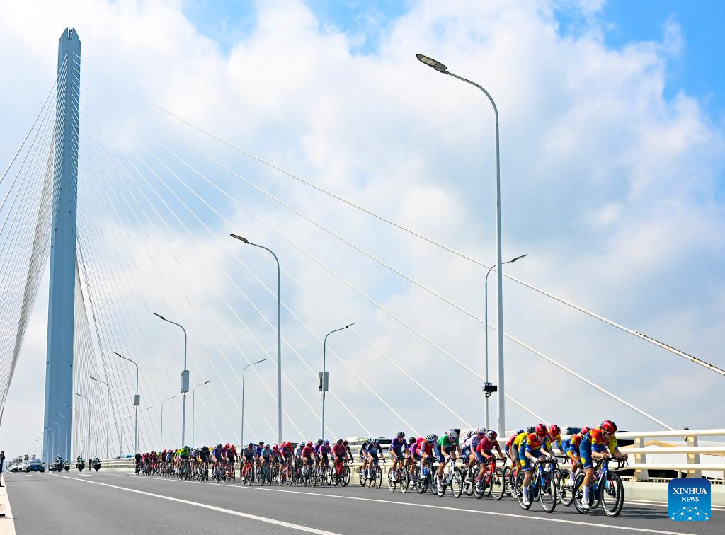 Cyclists compete across the Shanghai Yangtze River Bridge during the Stage 2 of the UCI Women's WorldTour Tour of Chongming Island road cycling race in Shanghai, east China, Oct. 15, 2025. (Xinhua/Chen Haoming)