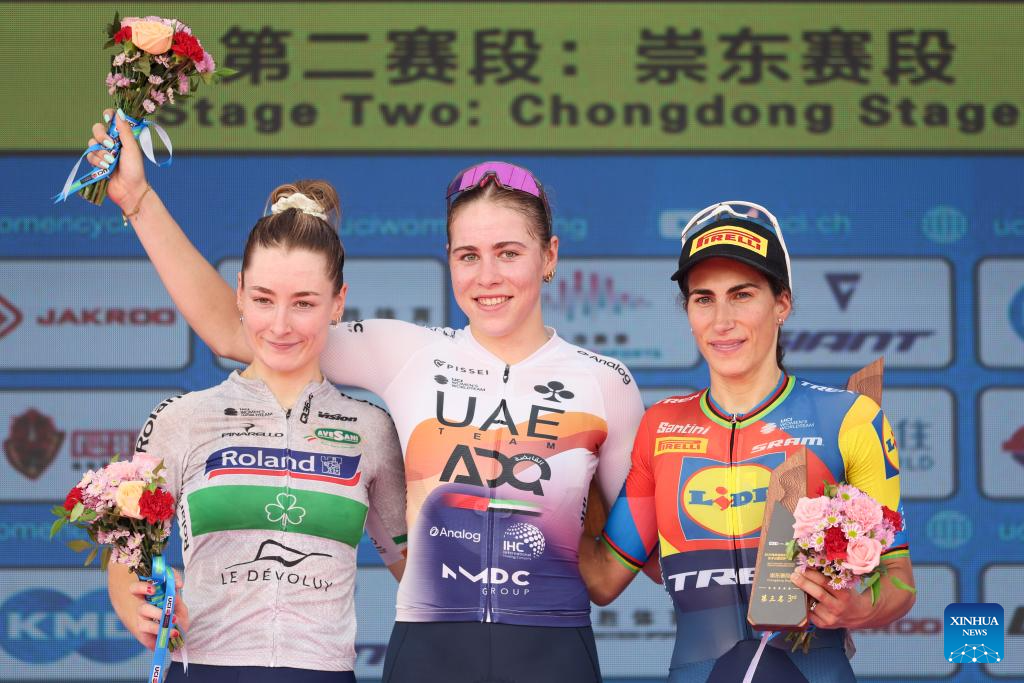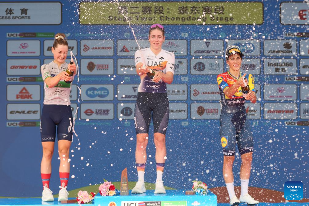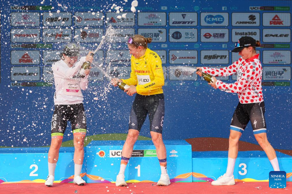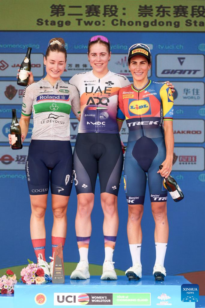 Sofie Van Rooijen (C) of UAE Team ADQ, in the yellow jersey, Anne Knijnenburg (R) of Volkerwessels Cycling Team, in the polka-dot jersey, and Yelizaveta Sklyarova of Born to Win BTC City Ljubljana Zhiraf, in the white jersey, celebrate on the podium after Stage 2 of the UCI Women's WorldTour Tour of Chongming Island road cycling race in Shanghai, east China, Oct. 15, 2025. (Xinhua/Wang Xiang)