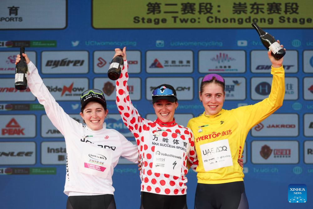 Sofie Van Rooijen (R) of UAE Team ADQ, in the yellow jersey, Anne Knijnenburg (C) of Volkerwessels Cycling Team, in the polka-dot jersey, and Yelizaveta Sklyarova of Born to Win BTC City Ljubljana Zhiraf, in the white jersey, celebrate on the podium after Stage 2 of the UCI Women's WorldTour Tour of Chongming Island road cycling race in Shanghai, east China, Oct. 15, 2025. (Xinhua/Wang Xiang)