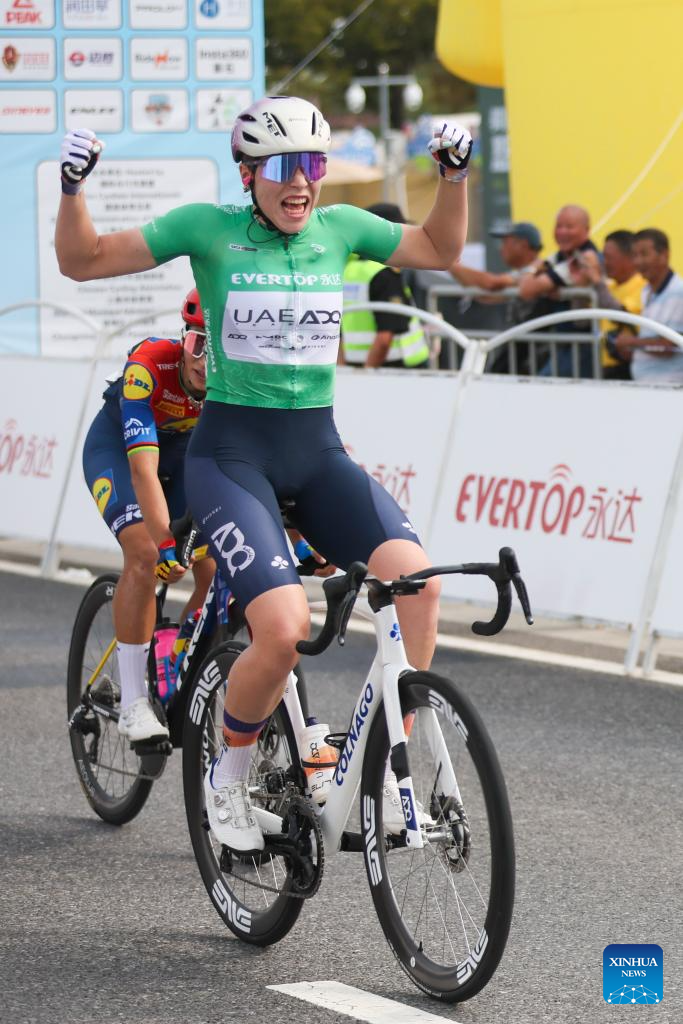 Sofie Van Rooijen of UAE Team ADQ celebrates after crossing the finish line in Stage 2 of the UCI Women's WorldTour Tour of Chongming Island road cycling race in Shanghai, east China, Oct. 15, 2025. (Xinhua/Wang Xiang)