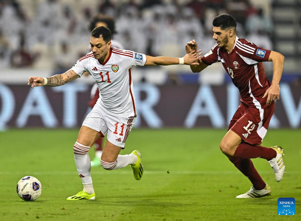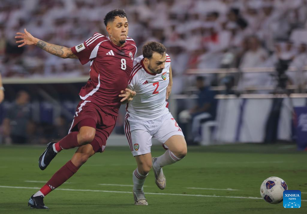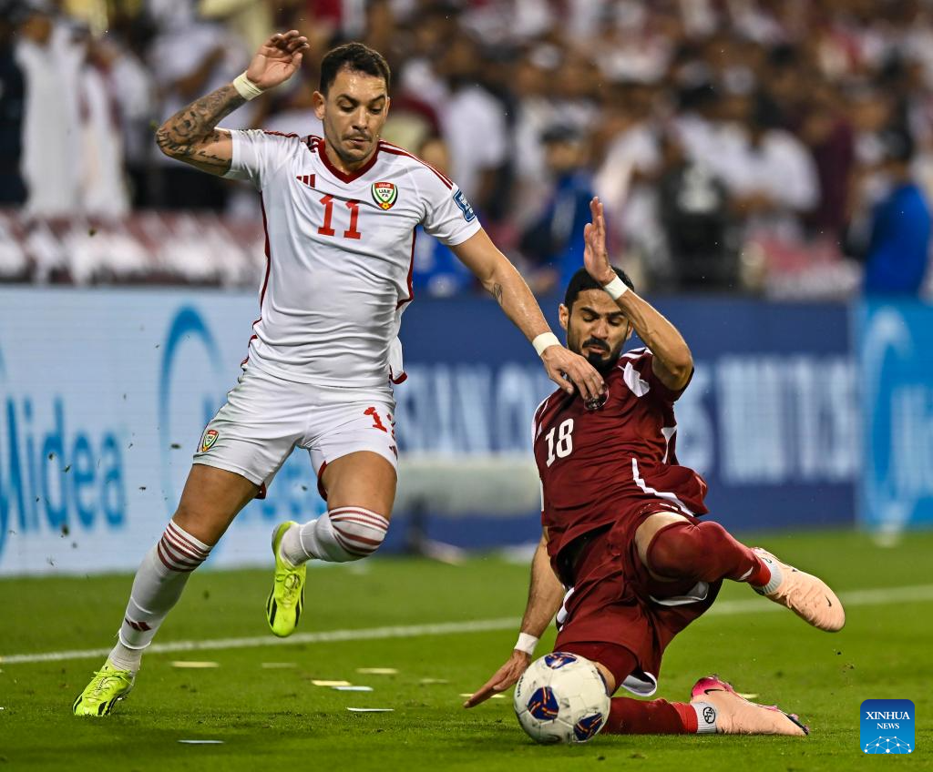 Edmilson Junior (L) of Qatar vies with Ruben Canedo of United Arab Emirates during the FIFA World Cup 2026 AFC Asian Qualifiers group A playoffs match between Qatar and United Arab Emirates in Doha, Qatar, Oct. 14, 2025. (Photo by Nikku/Xinhua)