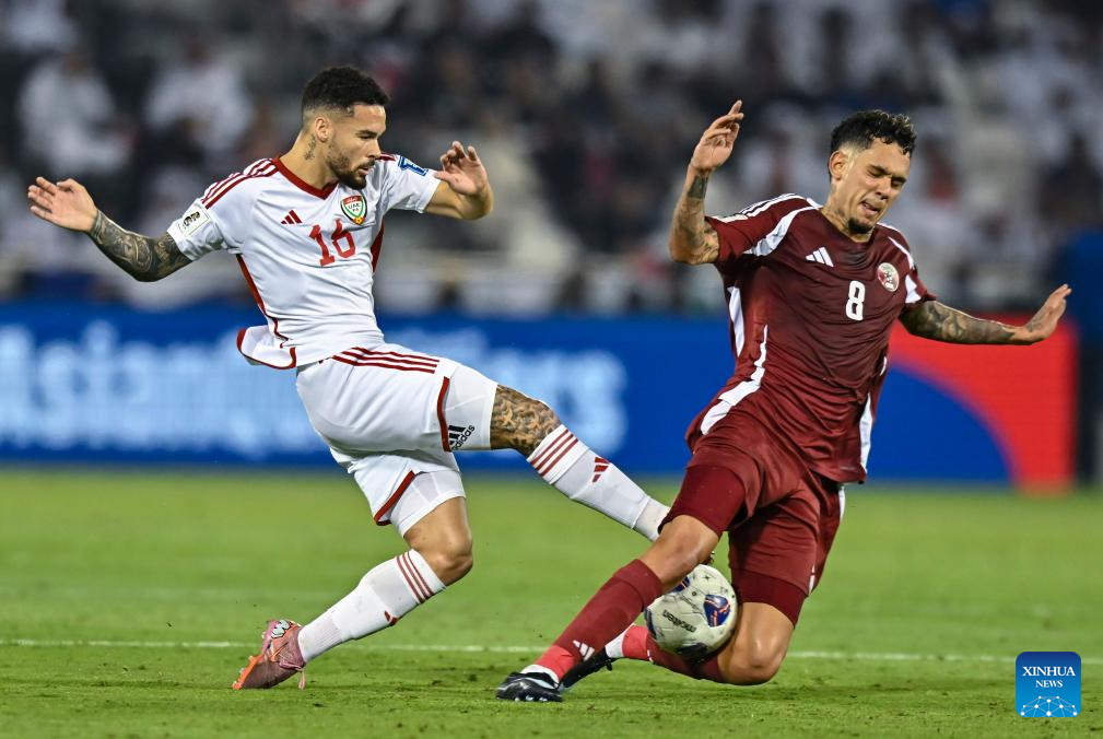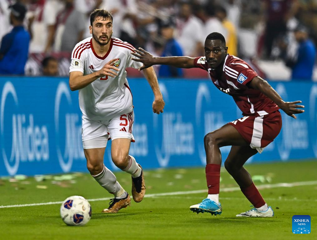 Karim Boudiaf (R) of Qatar vies with Caio Canedo of United Arab Emirates during the FIFA World Cup 2026 AFC Asian Qualifiers group A playoffs match between Qatar and United Arab Emirates in Doha, Qatar, Oct. 14, 2025. (Photo by Nikku/Xinhua)