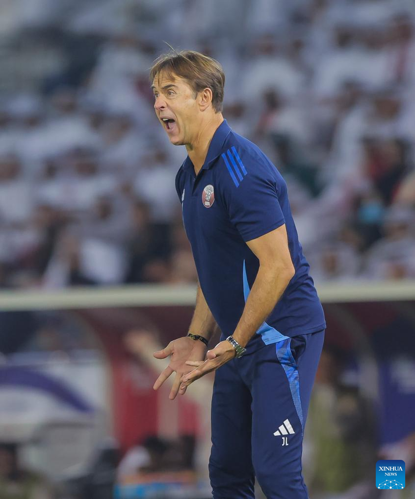Head coach of Qatar Julen Lopetegui reacts during the FIFA World Cup 2026 AFC Asian Qualifiers group A playoffs match between Qatar and United Arab Emirates in Doha, Qatar, Oct. 14, 2025. (Photo by Nikku/Xinhua)