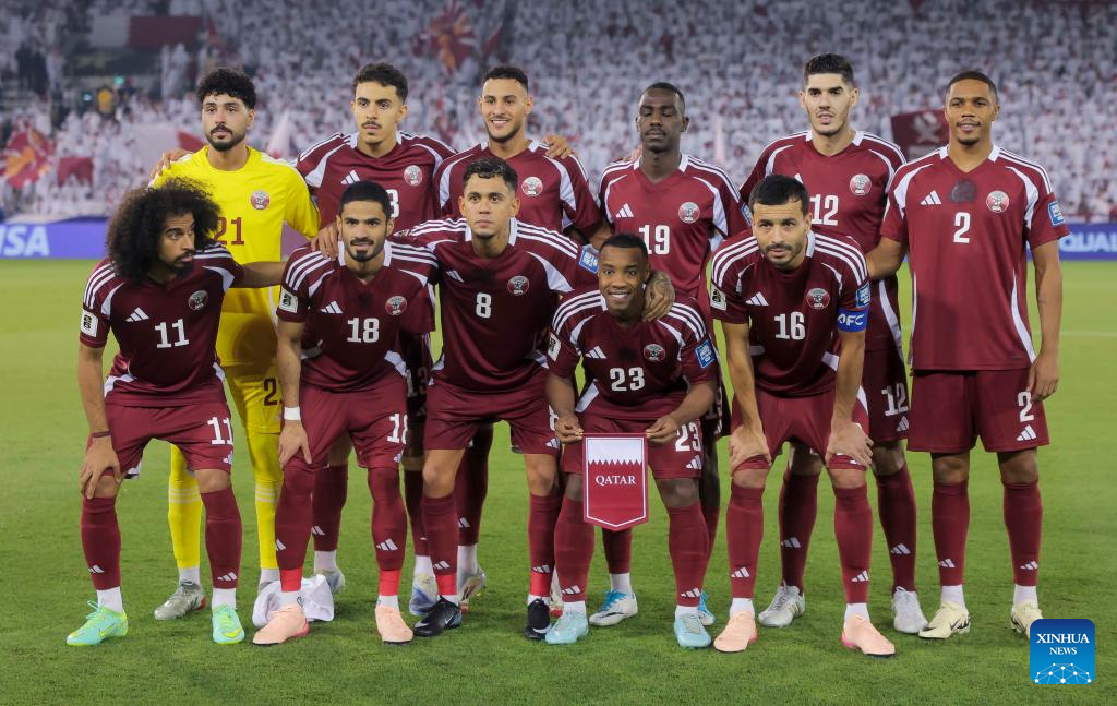 Starting players of Qatar pose for a group photo before the FIFA World Cup 2026 AFC Asian Qualifiers group A playoffs match between Qatar and United Arab Emirates in Doha, Qatar, Oct. 14, 2025. (Photo by Nikku/Xinhua)