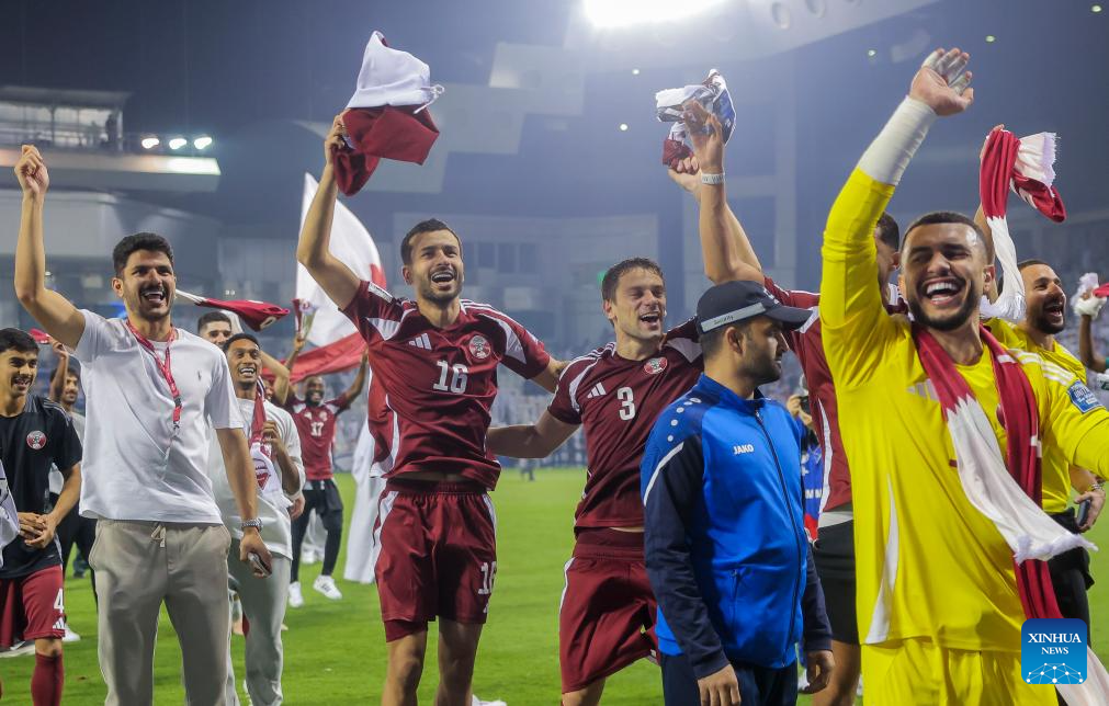 Players of Qatar celebrate after the FIFA World Cup 2026 AFC Asian Qualifiers group A playoffs match between Qatar and United Arab Emirates in Doha, Qatar, Oct. 14, 2025. (Photo by Nikku/Xinhua)