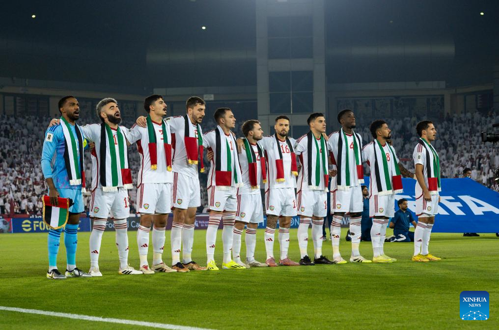 Starting players of United Arab Emirates line up before the FIFA World Cup 2026 AFC Asian Qualifiers group A playoffs match between Qatar and United Arab Emirates in Doha, Qatar, Oct. 14, 2025. (Photo by Nikku/Xinhua)