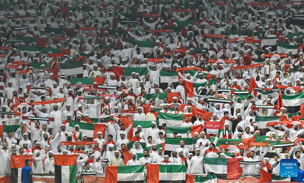 Supporters of United Arab Emirates cheer for the team during the FIFA World Cup 2026 AFC Asian Qualifiers group A playoffs match between Qatar and United Arab Emirates in Doha, Qatar, Oct. 14, 2025. (Photo by Nikku/Xinhua)