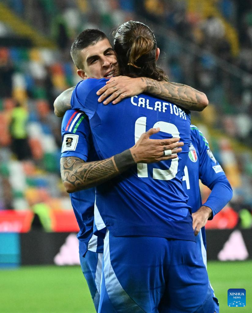 Gianluca Mancini (L) of Italy celebrates his goal with his teammate Riccardo Calafiori during the FIFA World Cup 2026 European Qualifiers Group I match between Italy and Israel in Udine, Italy, Oct. 14, 2025. (Photo by Diego Petrussi/Xinhua)