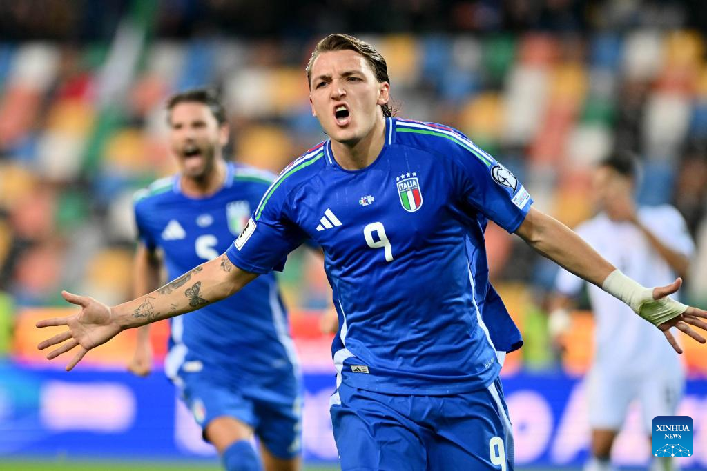 Mateo Retegui of Italy celebrates his goal during the FIFA World Cup 2026 European Qualifiers Group I match between Italy and Israel in Udine, Italy, Oct. 14, 2025. (Photo by Diego Petrussi/Xinhua)