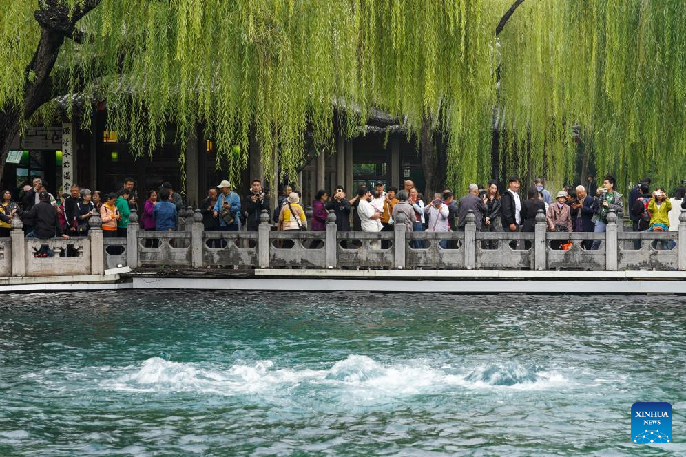 Tourists visit Baotu Spring in Jinan City, east China's Shandong Province, Oct. 15, 2025. Jinan, known as the "City of Springs," has seen its iconic Baotu Spring reach its highest water level in nearly six decades, according to local authorities.