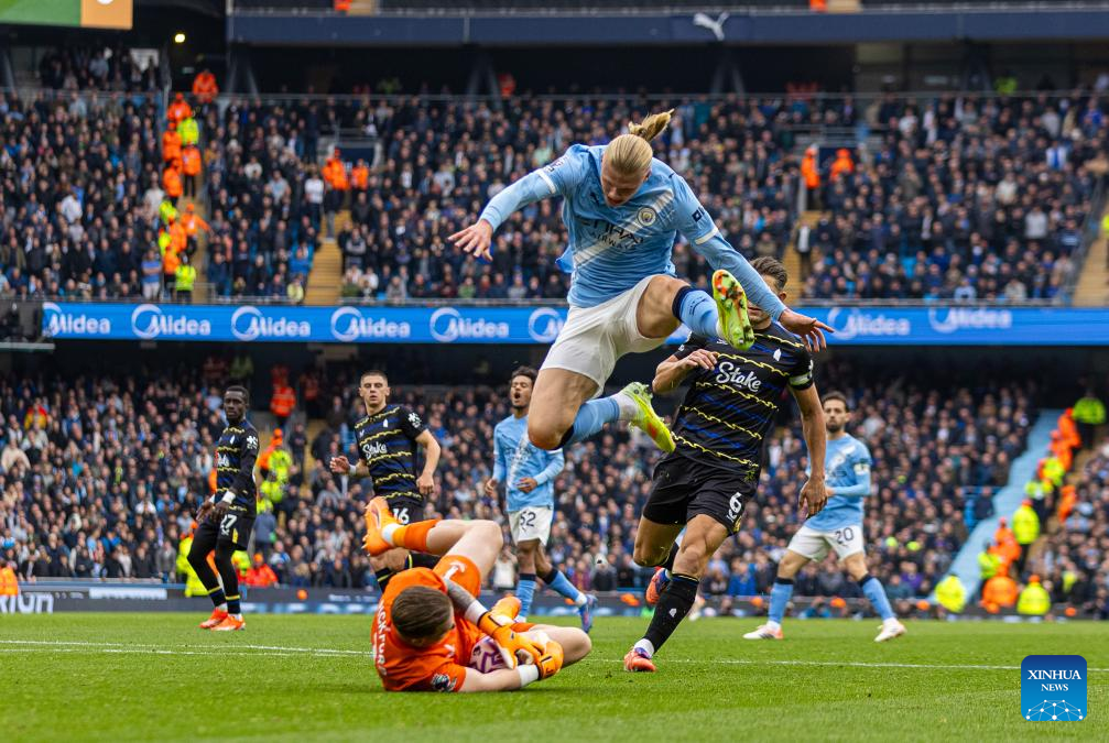 Manchester City's Erling Haaland (front R) skips over Everton's goalkeeper Jordan Pickford during the English Premier League match between Manchester City FC and Everton FC in Manchester, Britain, on Oct. 18, 2025. (Xinhua)