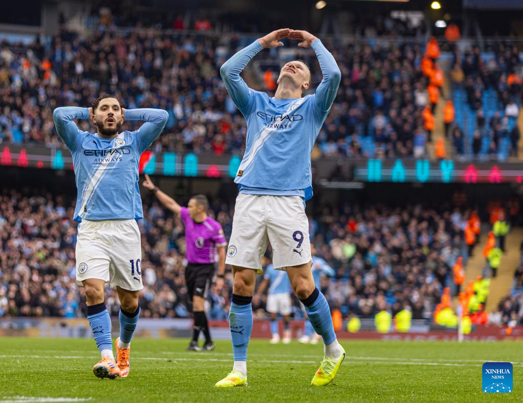 Manchester City's Erling Haaland (R) reacts after being denied a hat-trick during the English Premier League match between Manchester City FC and Everton FC in Manchester, Britain, on Oct. 18, 2025. (Xinhua)