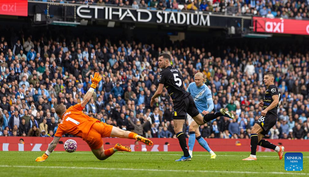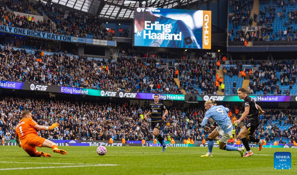 Manchester City's Erling Haaland (2nd R) is denied a hat-trick by Everton's goalkeeper Jordan Pickford (1st L) during the English Premier League match between Manchester City FC and Everton FC in Manchester, Britain, on Oct. 18, 2025. (Xinhua)