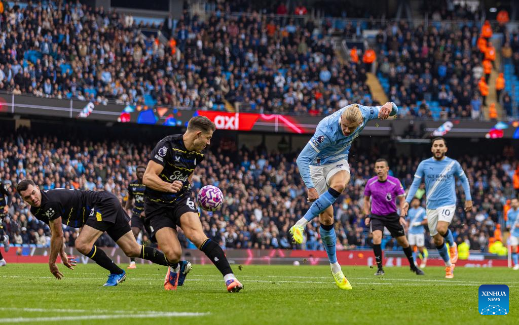 Manchester City's Erling Haaland (front R) shoots during the English Premier League match between Manchester City FC and Everton FC in Manchester, Britain, on Oct. 18, 2025. (Xinhua)
