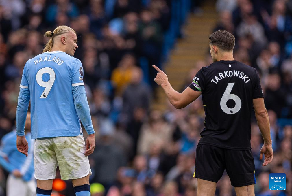 Manchester City's Erling Haaland (L) has words with Everton's James Tarkowski during the English Premier League match between Manchester City FC and Everton FC in Manchester, Britain, on Oct. 18, 2025. (Xinhua)