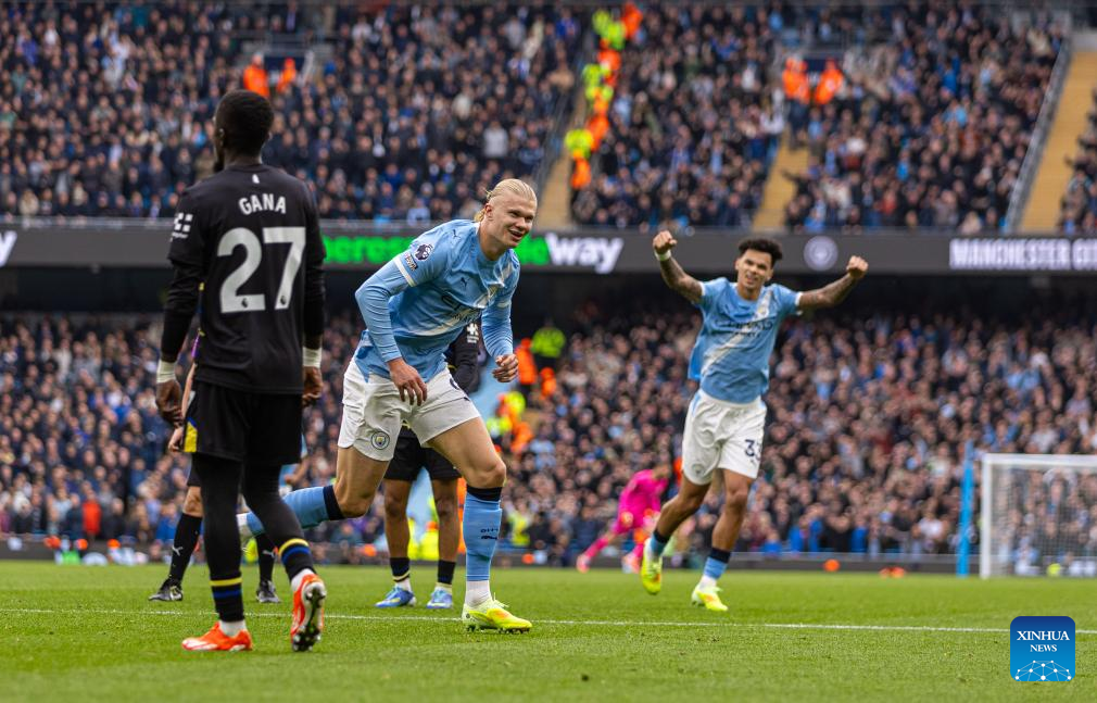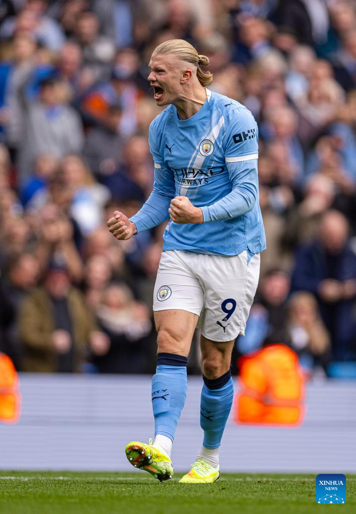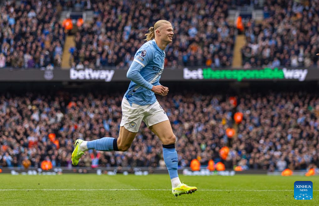 Manchester City's Erling Haaland celebrates after scoring the second goal during the English Premier League match between Manchester City FC and Everton FC in Manchester, Britain, on Oct. 18, 2025. (Xinhua)