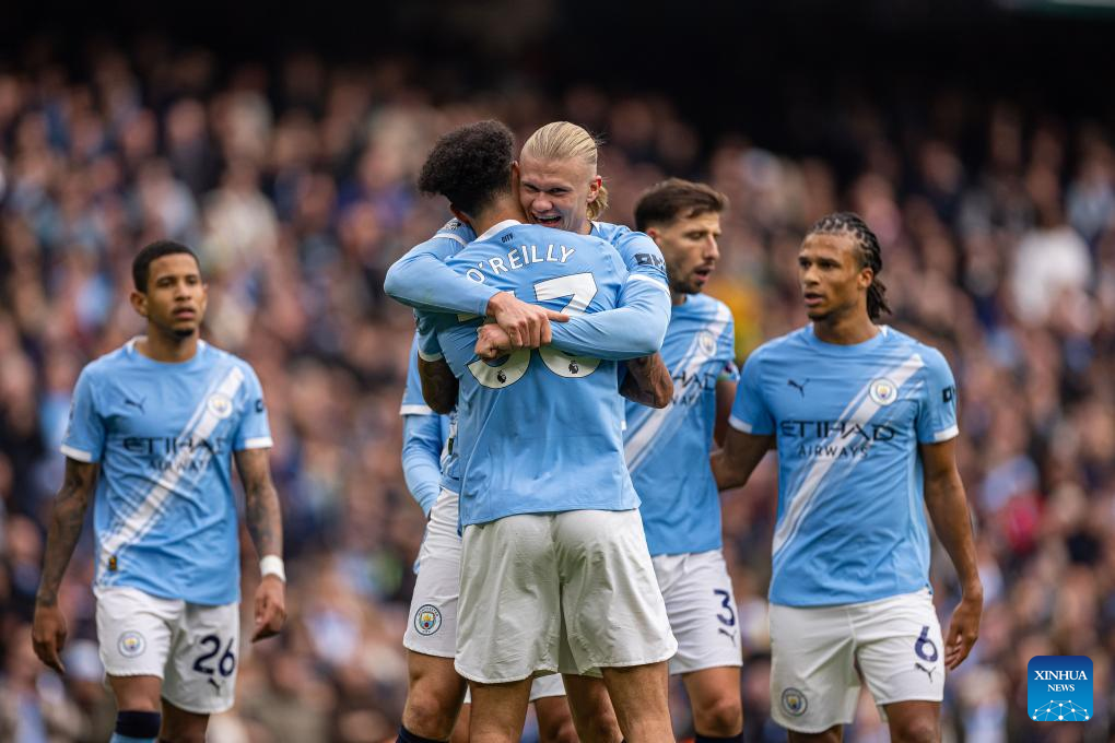 Manchester City's Erling Haaland (2nd L) celebrates after scoring the second goal during the English Premier League match between Manchester City FC and Everton FC in Manchester, Britain, on Oct. 18, 2025. (Xinhua)