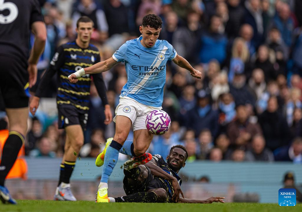 Manchester City's Phil Foden (front L) vies for the ball during the English Premier League match between Manchester City FC and Everton FC in Manchester, Britain, on Oct. 18, 2025. (Xinhua)
