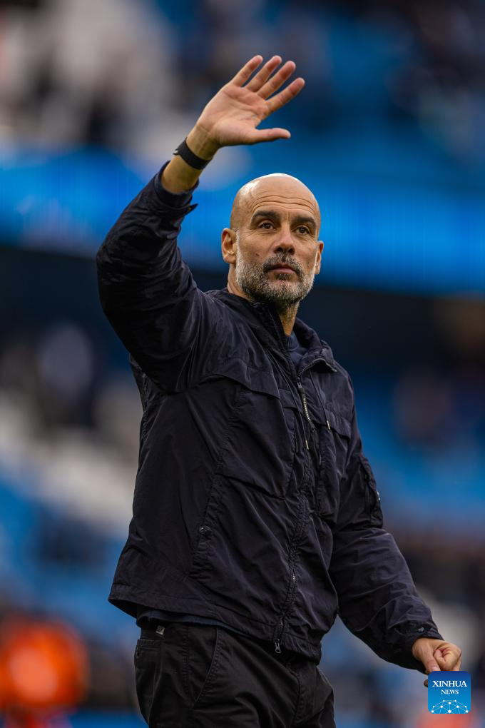 Manchester City's head coach Pep Guardiola waves to supporters after the English Premier League match between Manchester City FC and Everton FC in Manchester, Britain, on Oct. 18, 2025. (Xinhua)