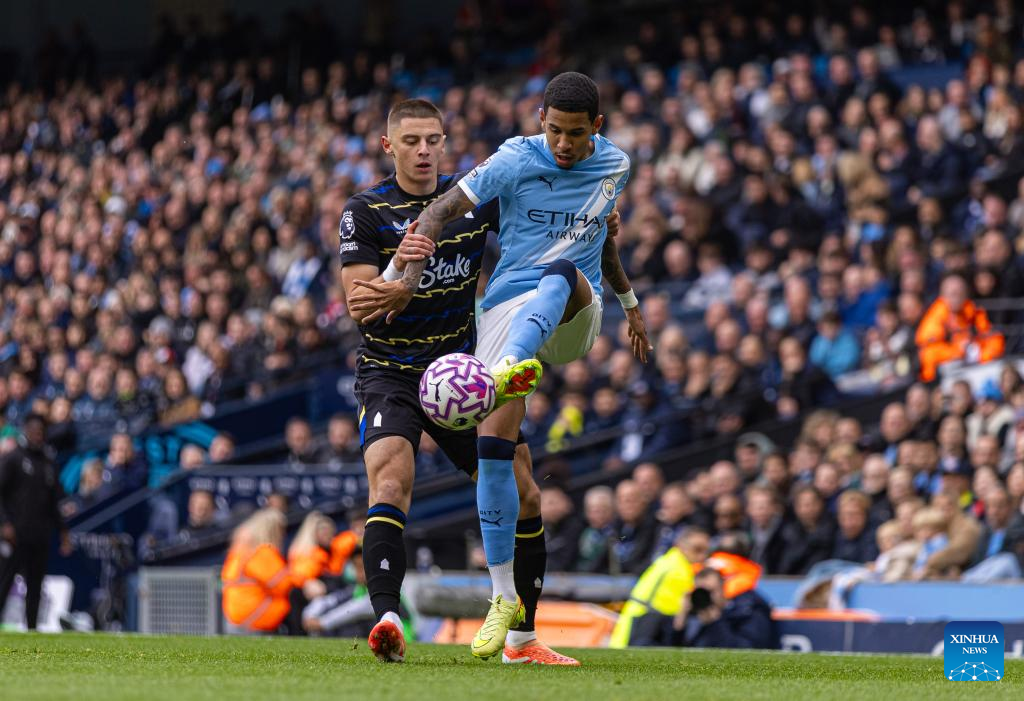 Manchester City's Savinho (R) is challenged by Everton's Vitaliy Mykolenko during the English Premier League match between Manchester City FC and Everton FC in Manchester, Britain, on Oct. 18, 2025. (Xinhua)