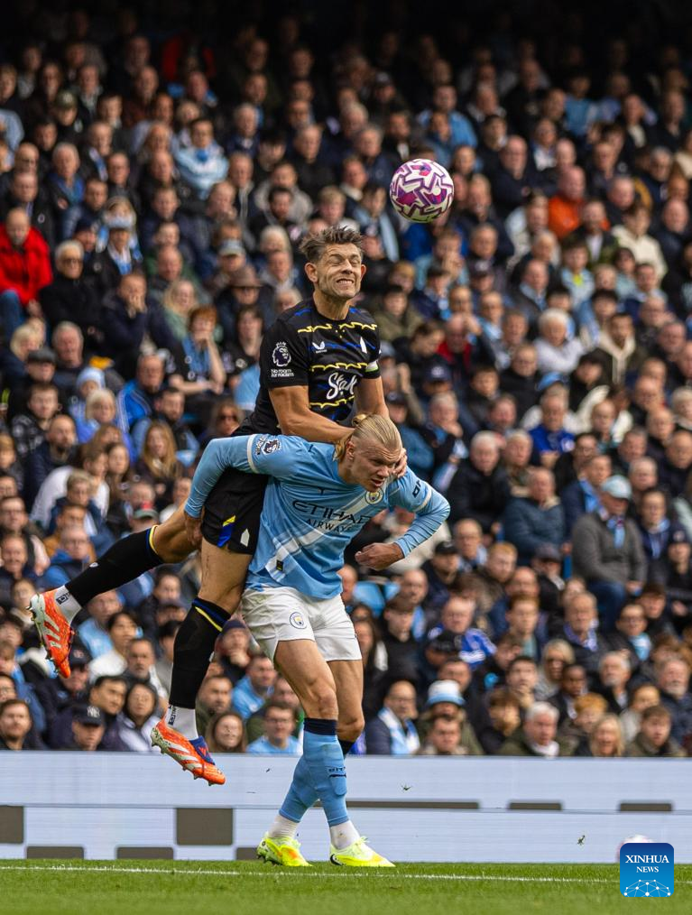 Everton's James Tarkowski (top) challenges for a header with Manchester City's Erling Haaland during the English Premier League match between Manchester City FC and Everton FC in Manchester, Britain, on Oct. 18, 2025. (Xinhua)