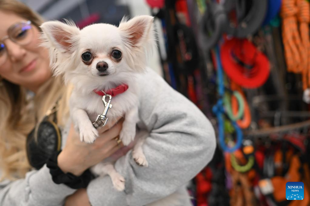 A woman poses photos with her dog during the "Pupilove" charity pet supplies sale in Warsaw, Poland, Oct. 19, 2025. The charity sale, in cooperation with local animal protection organizations, is regularly held to support animal shelters in several cities in Poland. (Photo by Aleksy Witwicki/Xinhua)