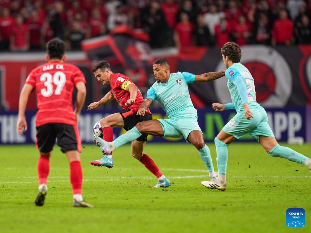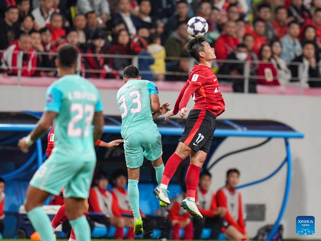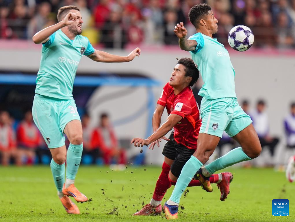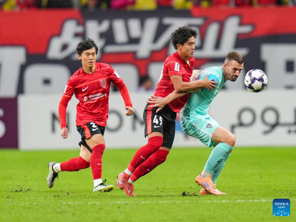 Felipe de Sousa Silva (Top L) of Chengdu Rongcheng heads the ball during the round 3 match between Chengdu Rongcheng of China and Johor Darul Ta'zim of Malaysia at AFC Champions League Elite in Chengdu, southwest China's Sichuan Province, Oct. 21, 2025. (Xinhua/Wang Xi)