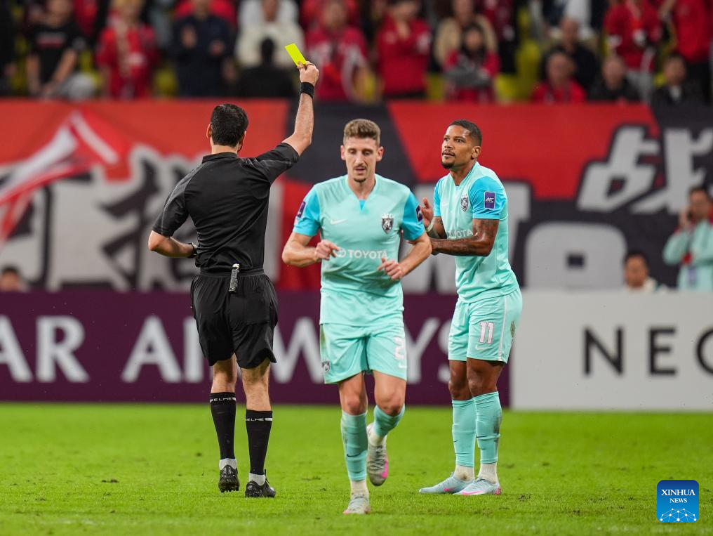Jairo de Macedo (R) of Johor Darul Ta'zim receives a yellow card from the referee during the round 3 match between Chengdu Rongcheng of China and Johor Darul Ta'zim of Malaysia at AFC Champions League Elite in Chengdu, southwest China's Sichuan Province, Oct. 21, 2025. (Xinhua/Wang Xi)