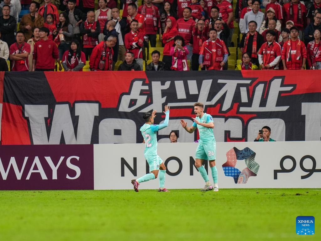 Oscar Arribas (R) of Johor Darul Ta'zim celebrates scoring with his teammate Arif Aiman during the round 3 match between Chengdu Rongcheng of China and Johor Darul Ta'zim of Malaysia at AFC Champions League Elite in Chengdu, southwest China's Sichuan Province, Oct. 21, 2025. (Xinhua/Wang Xi)