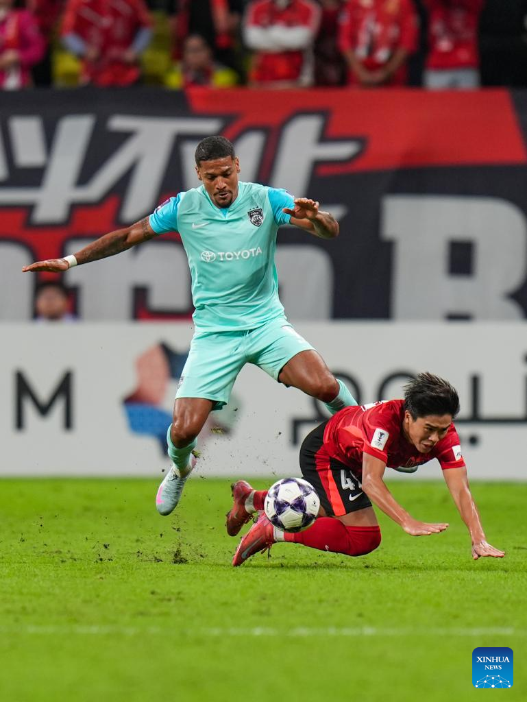 Jairo de Macedo (L) of Johor Darul Ta'zim vies with Xu Hong of Chengdu Rongcheng during the round 3 match between Chengdu Rongcheng of China and Johor Darul Ta'zim of Malaysia at AFC Champions League Elite in Chengdu, southwest China's Sichuan Province, Oct. 21, 2025. (Xinhua/Wang Xi)