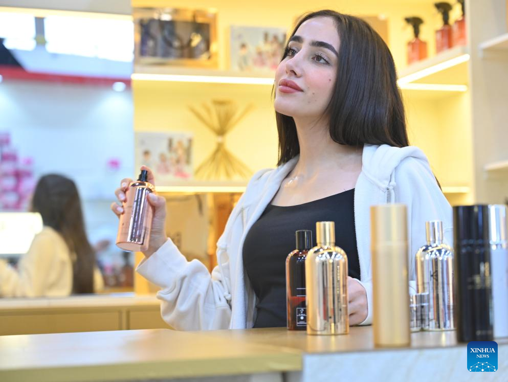 A man visits the Perfume Expo in Hawalli Governorate, Kuwait, Oct. 21, 2025. A Perfume Expo kicked off here in Kuwait on Tuesday and will last until Nov.1 with the participation of more than 400 companies from Kuwait, Saudi Arabia, Oman, Bahrain, Qatar and the Emirates in this field. (Photo by Asad/Xinhua)