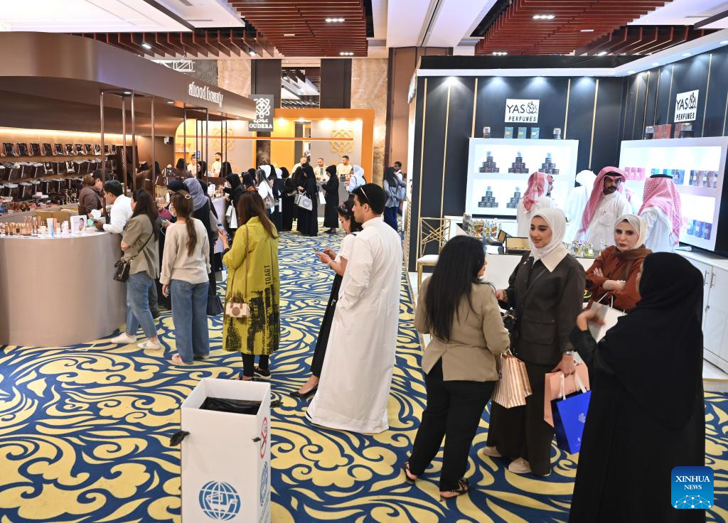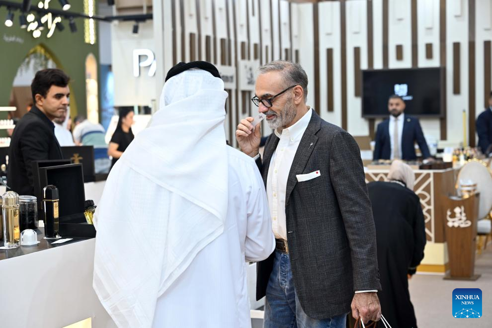 People visit the Perfume Expo in Hawalli Governorate, Kuwait, Oct. 21, 2025. A Perfume Expo kicked off here in Kuwait on Tuesday and will last until Nov.1 with the participation of more than 400 companies from Kuwait, Saudi Arabia, Oman, Bahrain, Qatar and the Emirates in this field. (Photo by Asad/Xinhua)