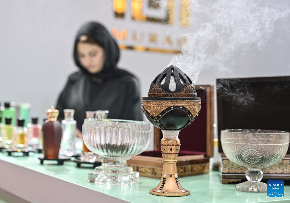 A woman displays incense burners during the Perfume Expo in Hawalli Governorate, Kuwait, Oct. 21, 2025. A Perfume Expo kicked off here in Kuwait on Tuesday and will last until Nov.1 with the participation of more than 400 companies from Kuwait, Saudi Arabia, Oman, Bahrain, Qatar and the Emirates in this field. (Photo by Asad/Xinhua)