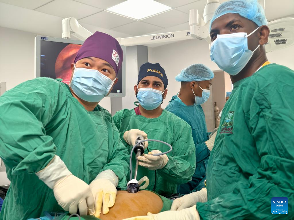 Bao Zengtao (1st L), a general surgeon and the team leader of the 35th Chinese medical team in Zanzibar, works with Tanzanian doctors during a laparoscopic surgery at Lumumba Hospital in Zanzibar, Tanzania, Oct. 20, 2025. (The 35th Chinese medical team in Zanzibar/Handout via Xinhua)
